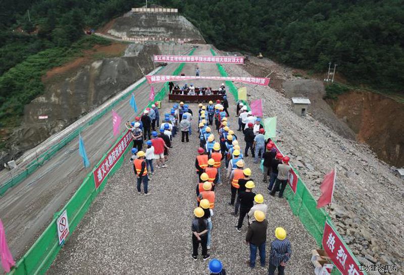 該工程是一座混凝土面板堆石壩,壩高47m,大壩填筑工程量42萬m3,大壩于2021年3月5日開始填筑,2021年6月30日填筑完成。大壩填筑完成后,得到了建設(shè)單位、監(jiān)理單位及總包單位的祝賀與肯定。該工程屬貴州省“鄉(xiāng)鄉(xiāng)有穩(wěn)定水源”項目,年供水量250.8萬m3,建成后可為安樂溪鄉(xiāng)集鎮(zhèn)及農(nóng)村20000余人提供安全穩(wěn)定供水和21670畝農(nóng)田灌溉用水以及將極大緩解當(dāng)?shù)厝彼桶踩嬎畣栴},意義重大。施工項目部將繼續(xù)堅持“科學(xué)管理、精心組織”理念,嚴(yán)格按設(shè)計和規(guī)范要求,在確保安全和質(zhì)量的前提下加快施工進(jìn)度,為安樂溪人民盡早提供安全水、干凈水及改善供水目標(biāo),確保在合同工期以內(nèi)按時、按質(zhì)、按量盡早建成交付建設(shè)單位投入使用。集團(tuán)副總裁胡鴻煌參加大壩封頂儀式。