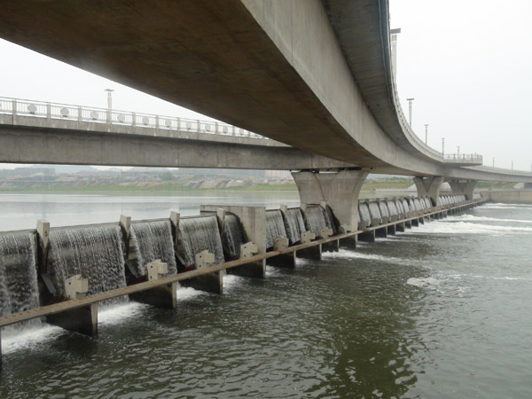 三級抬水壩全長184.5m,采用22扇4m×8m漸開滾輪連桿式水力自控翻板閘門抬水;水力自控翻板閘壩主要由翻板閘門、隔墩、邊墩和門下的壩體、上游防滲設(shè)施、下游消能防沖設(shè)施等組成。人行景觀橋橋梁全長為293.52m,跨徑布置為48+50+50+48m預(yù)應(yīng)力砼連續(xù)箱梁,采用預(yù)應(yīng)力砼等梁高連續(xù)梁結(jié)構(gòu),平面上呈“X”型,后因在橋梁在2號橋墩處橋面增設(shè)直徑為20m的觀光平臺,因此又稱“蝴蝶橋”。