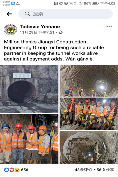 參觀結(jié)束時,Tadesse先生由衷感謝大家的辛勤付出,對項目部順利完成隧洞首倉襯砌砼表示高度贊許,并相信項目部一定能保質(zhì)保量完成隧洞二期襯砌施工。Tadesse先生還在Facebook(臉書)平臺分享了本次隧洞參觀的經(jīng)歷,并表達了對我公司作為戰(zhàn)略合作伙伴的充分信任。