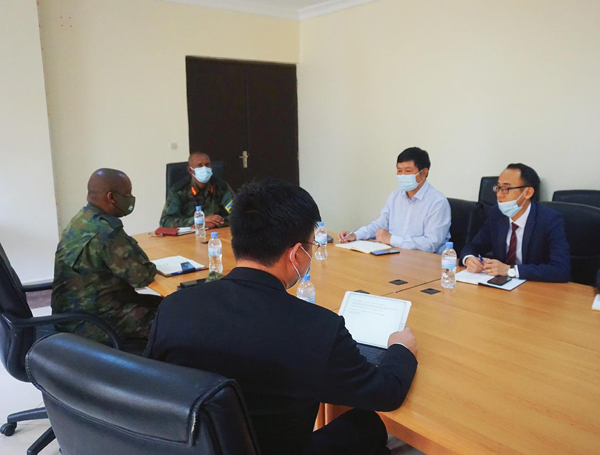 張周平一行會(huì)見了軍事學(xué)院項(xiàng)目業(yè)主--盧旺達(dá)軍事學(xué)院司令。雙方就疫情期間項(xiàng)目的施工情況進(jìn)行了充分的交流,氣氛熱烈融洽。雙方非常珍惜和重視此次合作,表示會(huì)全力支持推動(dòng)項(xiàng)目進(jìn)展,并期待兩個(gè)團(tuán)隊(duì)在日后工作中能夠繼續(xù)保持積極有效的溝通,務(wù)實(shí)地解決施工難點(diǎn),盡早完成預(yù)期建筑施工目標(biāo)。