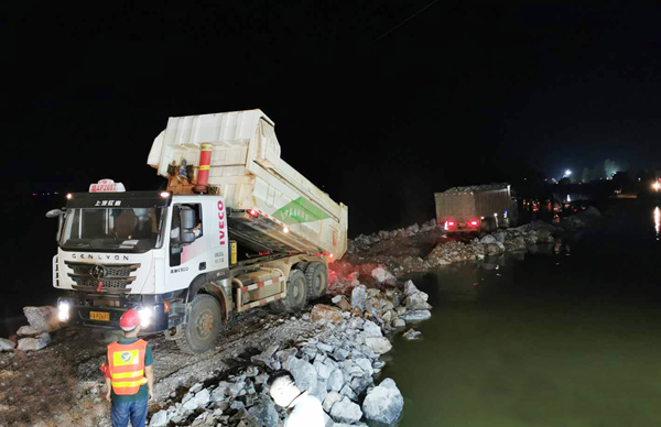 7月13日下午,公司完成封堵工作技術(shù)測量和封堵工作技術(shù)方案制定,7月13日晚上,搶險技術(shù)、施工人員及設(shè)備陸續(xù)進(jìn)場,并調(diào)配塊石、砂礫石等各類材料進(jìn)場。決口封堵采取南北兩岸同時進(jìn)占方式施工, 7月14日中午14時開始進(jìn)占施工,經(jīng)過兩天兩夜連續(xù)55個小時施工作業(yè),于7月16日晚上21時43分,完成決口合攏,比預(yù)計(jì)完工時間提前50小時。